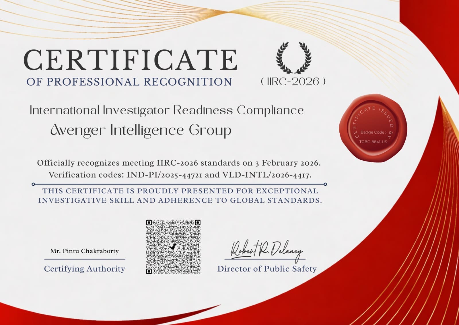 I am Pintu Chakraborty, founder of Avenger Intelligence Group. With extensive field experience, I established this agency to deliver trustworthy, discreet, and result-oriented investigative services.Our mission is to provide accurate intelligence that empowers individuals and organizations to make the right decisions.I have worked across complex personal and corporate cases, understanding the sensitive nature of every assignment. At Avenger Intelligence Group, we combine advanced technology with expert ground intelligence.Our team is trained in surveillance, cyber analysis, criminology, and legal processes.Every investigation is handled with complete confidentiality and professionalism. I personally oversee major cases to ensure precision and reliability. Your solution is just one call away.